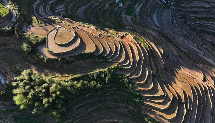 圖為5月17日拍攝的夕陽映照下的紫鵲界梯田(無人機照片)。新華社記者 趙眾志 攝