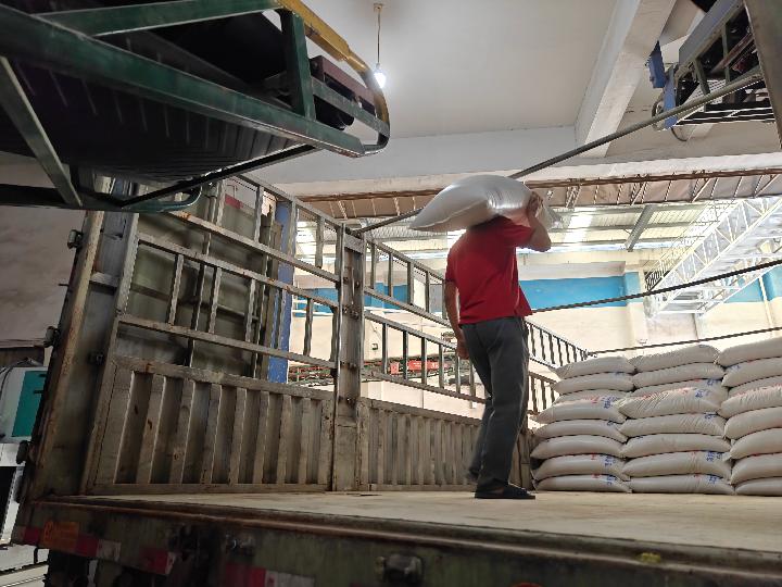自動傳輸帶架在一臺大貨車的貨廂上,幾名工人嫻熟配合,把一袋袋大米卸下壘好……在位于湖南省益陽市赫山區的蘭溪米市,剛剛上市的新糧經過加工包裝后,從這里運往全國各地。