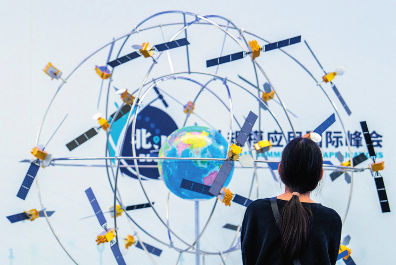 在株洲國際會展中心,觀眾在觀看北斗系統組網模型(2023 年 10 月 26 日攝)陳思汗攝 / 本刊