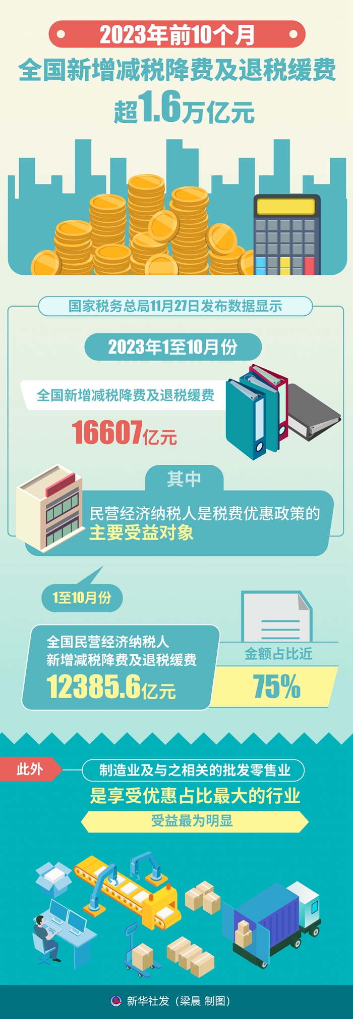 新華社北京11月27日電(記者王雨蕭)國家稅務總局27日發布數據顯示,今年1至10月份,全國新增減稅降費及退稅緩費16607億元。