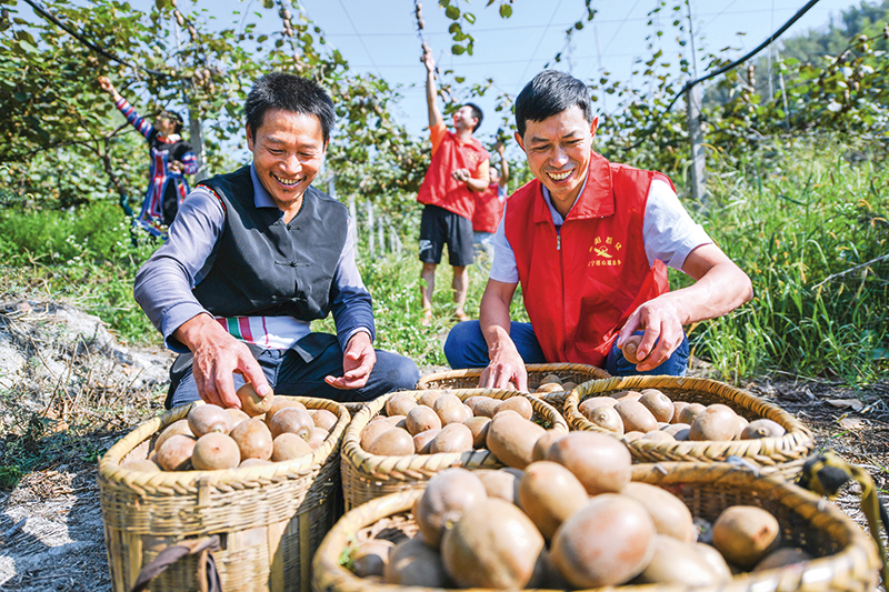 湖南省衡陽市黨員干部在常寧市塔山瑤族鄉陽山村幫助村民采摘獼猴桃(2023年9月攝)   周秀魚春攝