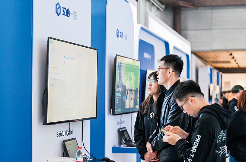 在百度世界大會2023現場,參會者在展區試用百度“文心一言”(2023年10月17 日攝) 張漫子攝/本刊