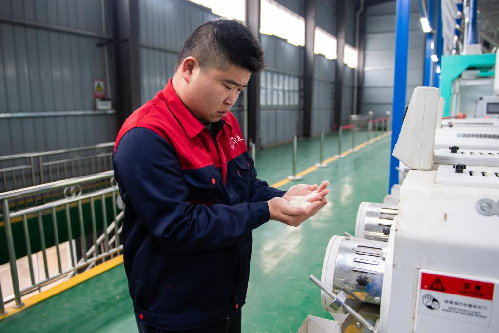 圖為陳帥宇在車間抽查生產過程中大米的品質。新華社記者陳思汗 攝