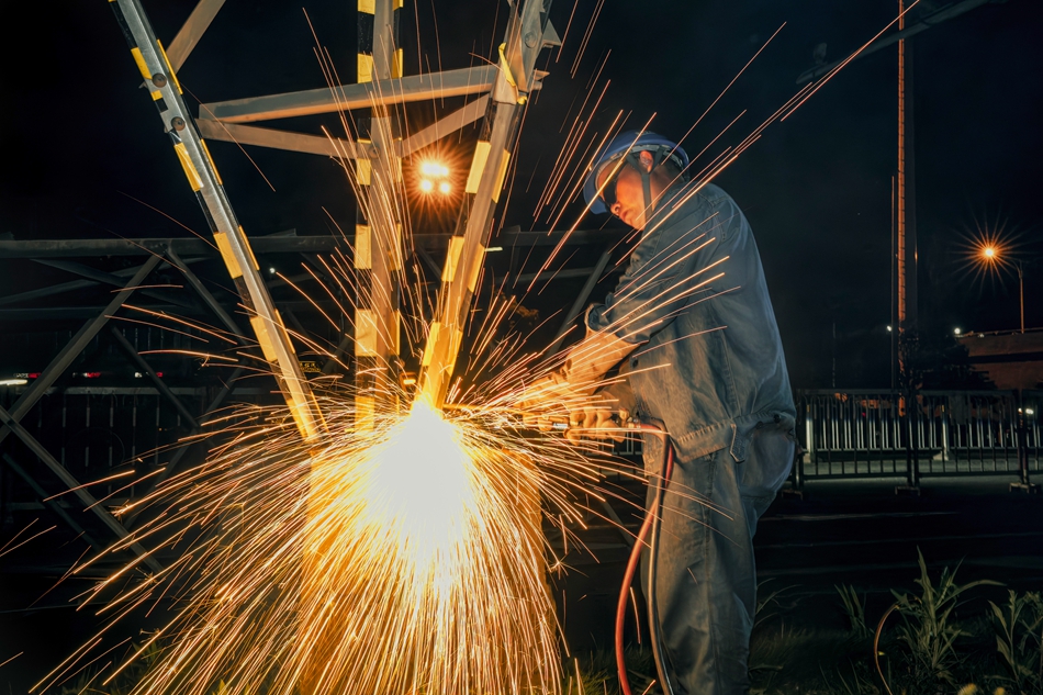 7月1日21:00,國網長沙供電公司工作人員對黑石鋪110千伏學羅大新線鐵塔進行拆除。 巫宇龍 攝pagebreak