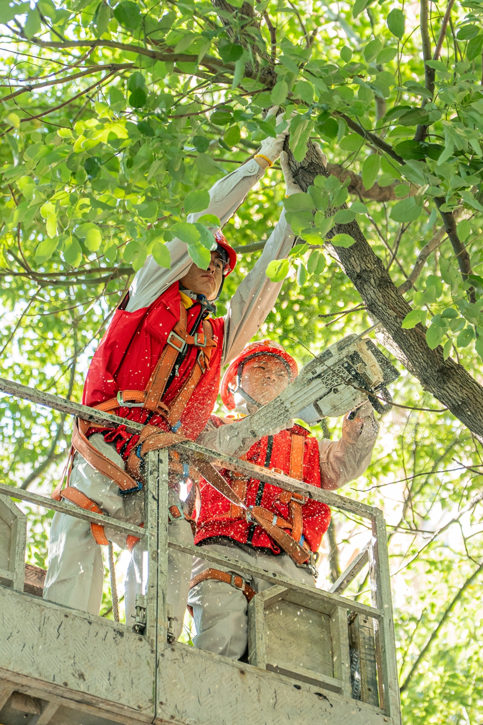 7月4日7:00,國網長沙供電公司輸電檢修人員對木蓮路上危及輸電設備安全度夏的行道樹開展清理。石磊 攝pagebreak