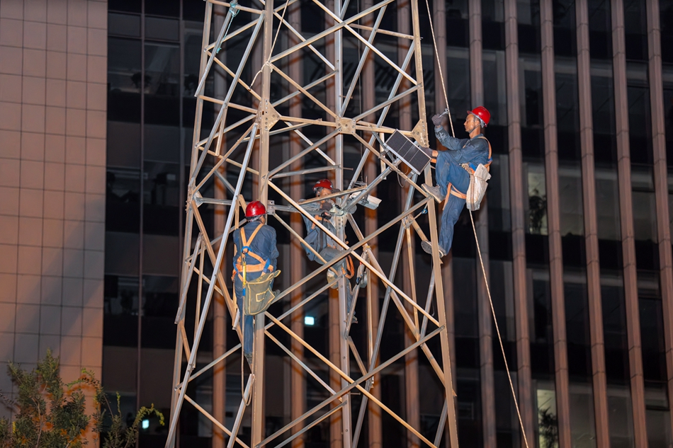 7月2日凌晨1:20,國網長沙供電公司工作人員在鐵塔上作業。巫宇龍 攝pagebreak