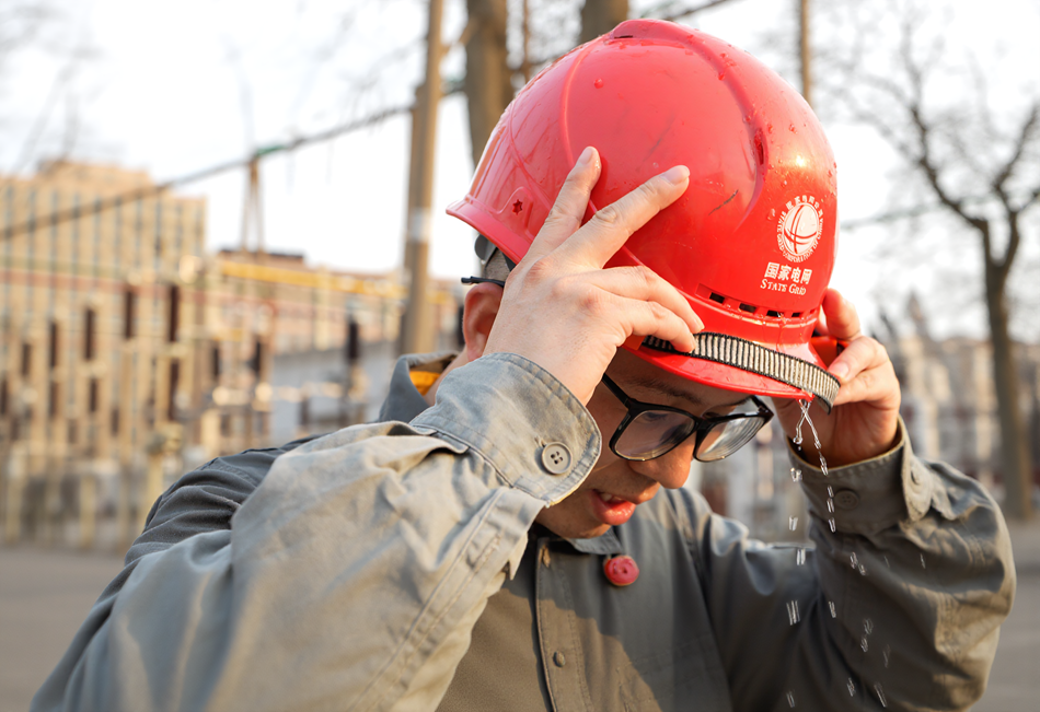 7月8日晚上18:45,變電運維公司工作人員在220千伏樹木嶺變電站開展特巡后摘下安全帽的瞬間。劉熠揚 攝pagebreak
