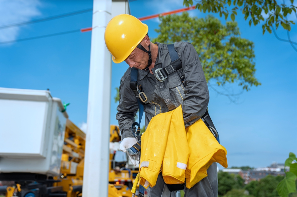 7月9日下午15:46,長沙帶電作業配網不停電作業二班配網不停電作業人員從線路上下來渾身已濕透。巫宇龍 攝