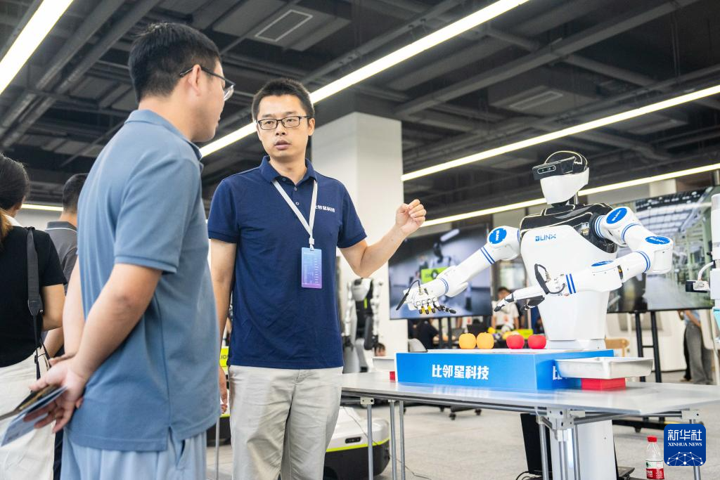 9月15日,在湖南湘江新區長沙智谷,工作人員(右)在介紹一款人形機器人的分揀功能。新華社記者 陳思汗 攝pagebreak