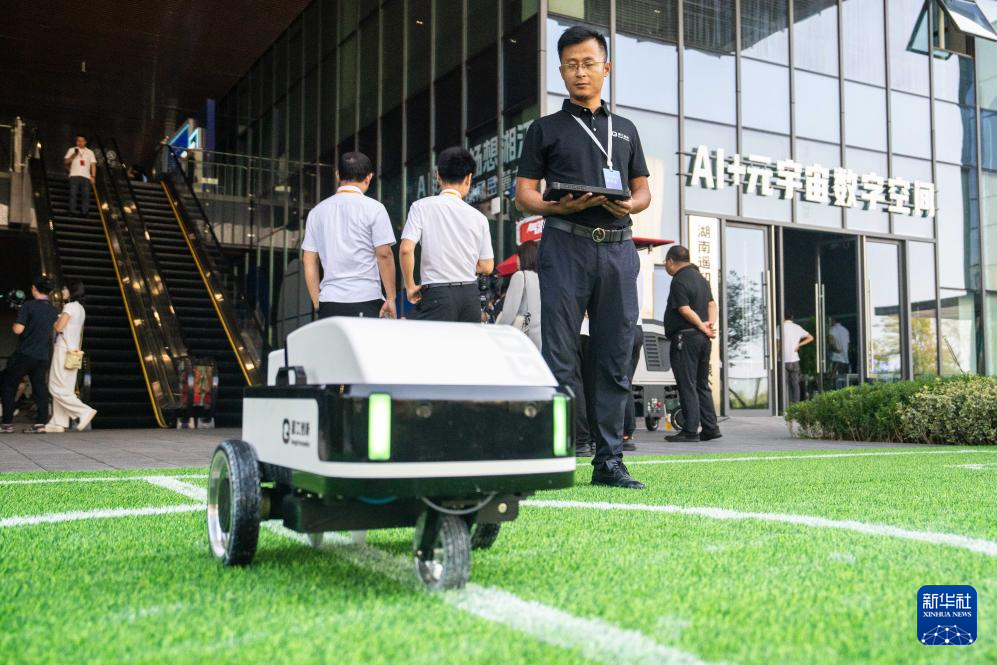 9月15日,在湖南湘江新區長沙智谷,工作人員操作球場畫線作業機器人。新華社記者 陳思汗 攝pagebreak
