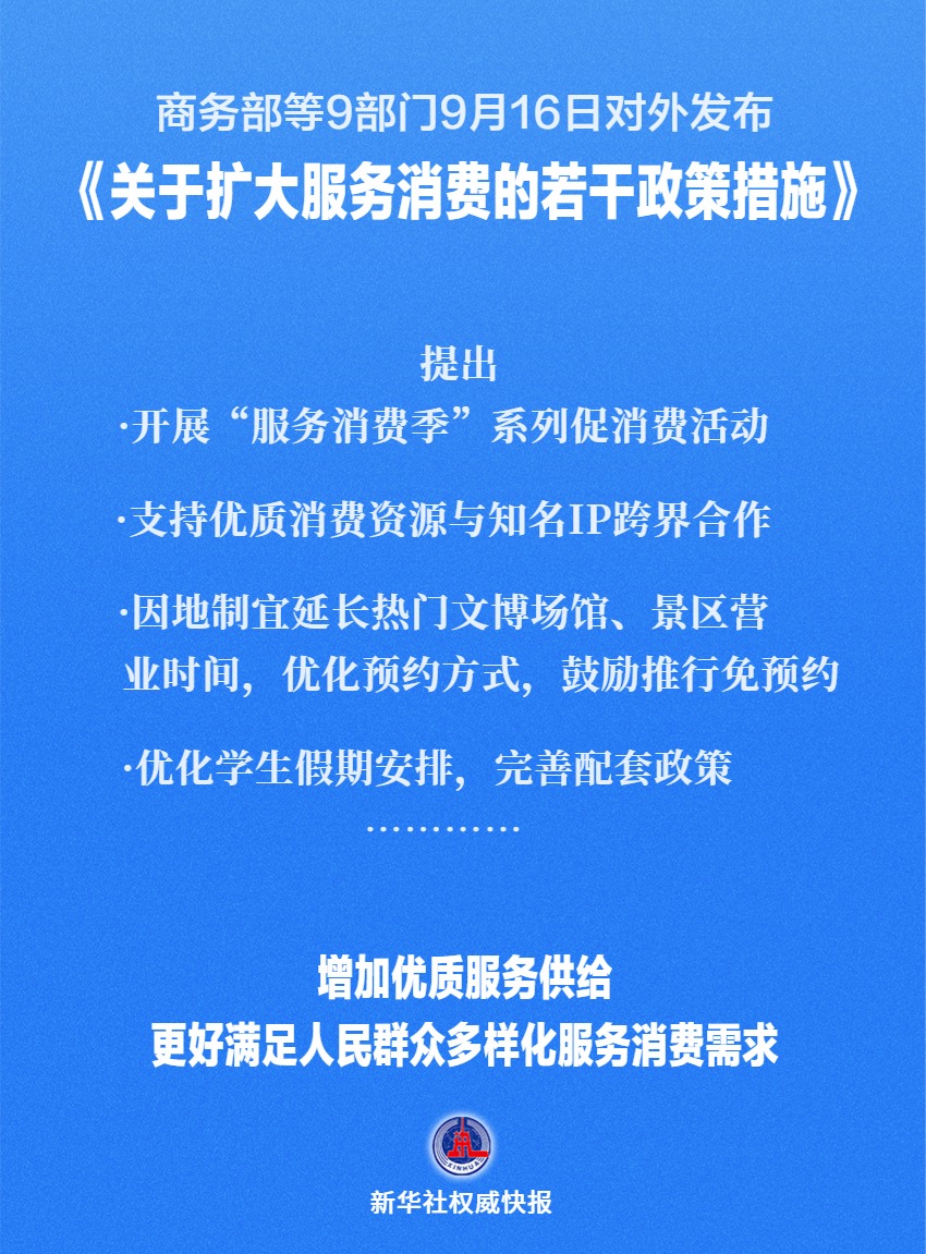 新華社北京9月16日電(記者王雨蕭、魏弘毅)商務部等9部門16日對外發布《關于擴大服務消費的若干政策措施》,提出五方面19條舉措進一步擴大服務消費。