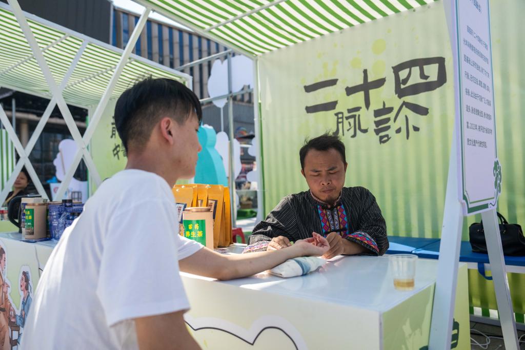 在五溪非遺園,游客(左)在體驗脈診。新華社記者 陳思汗 攝