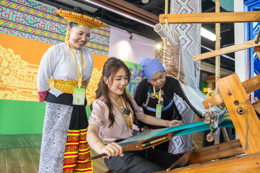 在湖南省懷化市五溪非遺園,游客在體驗侗族織錦技藝。新華社記者 陳思汗 攝