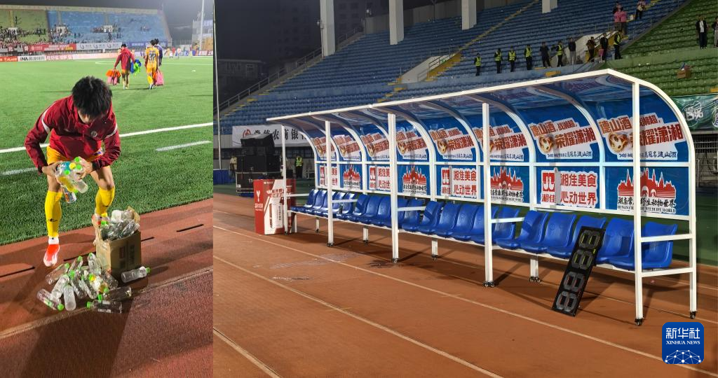 比賽結束后,“不留垃圾”在一些球迷、球隊中蔚然成風。9月26日晚,記者在現場看到,大比分告負的張家界隊員較為沮喪,但他們不忘清掃水瓶,留下整潔的替補席。