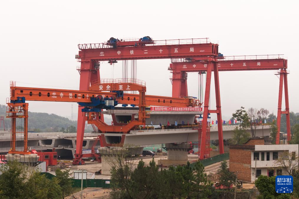 10月13日,中鐵二十五局工人在邵永高鐵跨蘆洪江特大橋架梁施工現場作業。新華社記者 陳思汗 攝