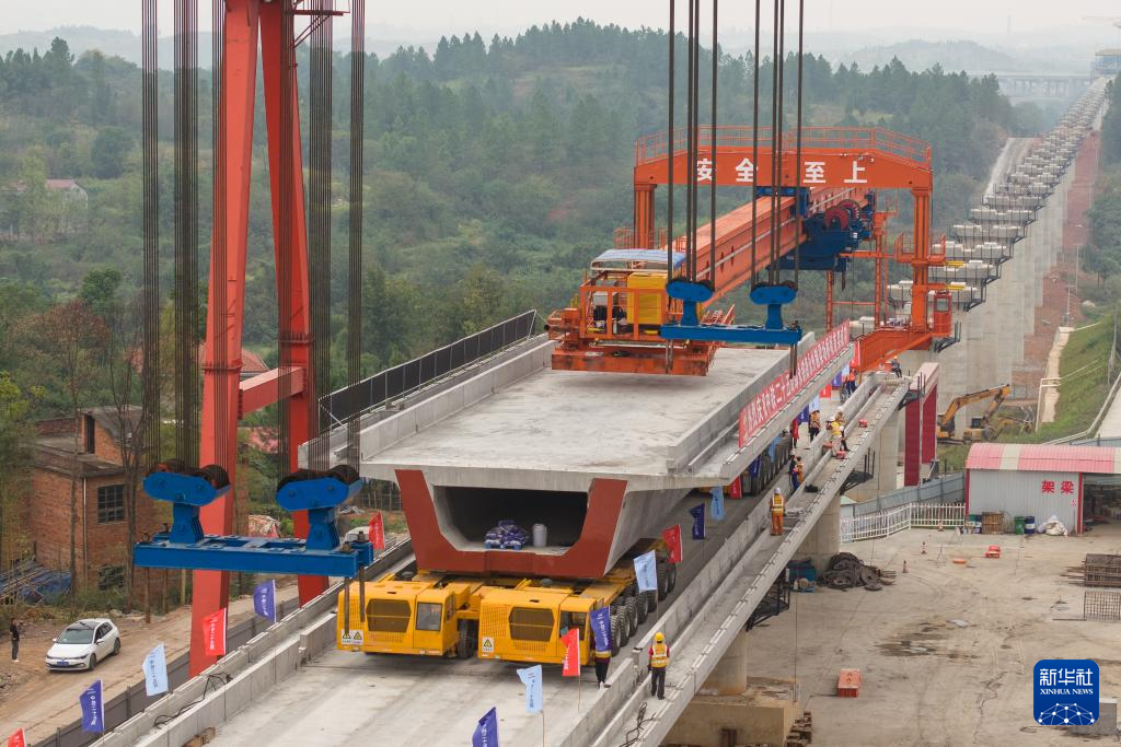 這是10月13日拍攝的邵永高鐵跨蘆洪江特大橋架梁施工現場(無人機照片)。新華社記者 陳思汗 攝