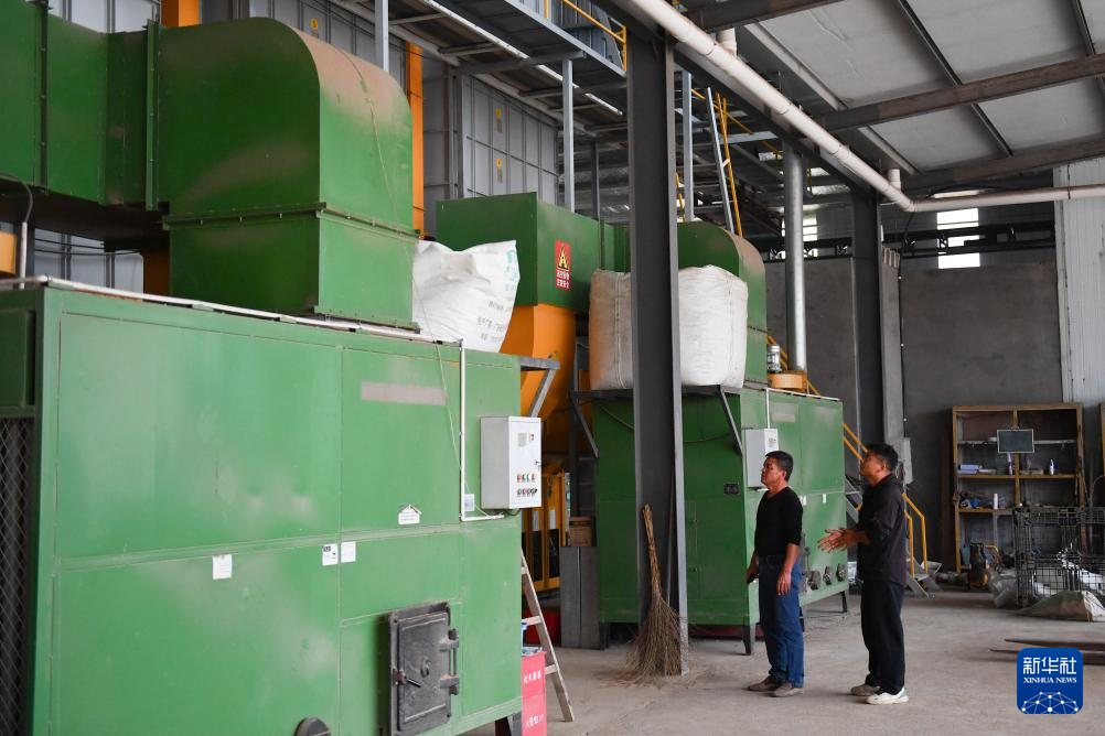 10月29日,邱彬(右)和父親邱國清在查看烘干機運行情況。新華社記者 陳振海 攝pagebreak